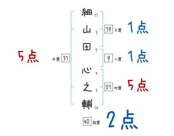 地運![]() | 細山田心之輔さんの地運は21画の5つ星!統率力がある。独立し成功する。名誉を手に入れる。 個性を表す基礎的な運勢です。性格形成や対人関係、行動力など家庭環境に影響されます。主に誕生してから20歳くらいまでの若年期の運勢を表します。 |