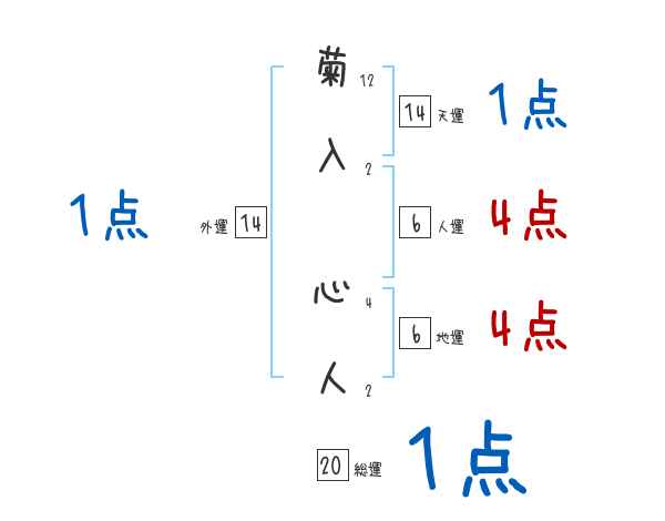 天運![]() | 菊入心人さんの天運は14画の1つ星!人に対して優しいがストレスを溜め込みがち。人間関係のトラブルを避けるよう気をつけましょう。 家系が持つ宿命的な運勢を表します。祖先から受け継いだ苗字ですので自分の力が及びません。家柄を象徴します。 |