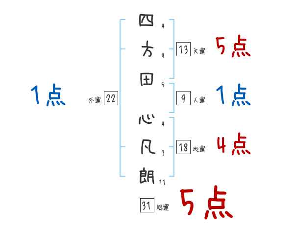 外運![]() | 四方田心凡朗さんの外運は22画の1つ星!努力することが苦手ないっぽう手先が器用。芸術性にも優れる。 生活面を象徴する運勢です。外部から受ける影響力を表し、結婚運、家庭運や職場、環境への順応性を表します。 |