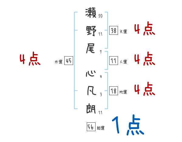 総運![]() | 瀬野尾心凡朗さんの総運は56画の1つ星!消極的で無気力になりがち。誠実な気持ちが必要でしょう。 あなたの人生を表す1番重要な運勢です。生涯を通じて影響する総合運となり、主に50歳以降の晩年期に影響を及ぼします。 |