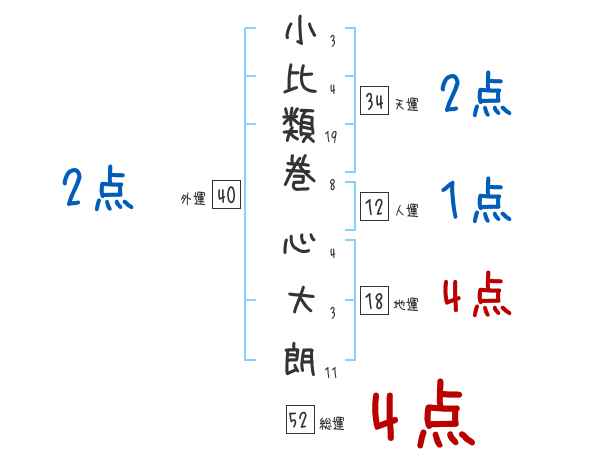 人運![]() | 小比類巻心大朗さんの人運は12画の1つ星!簡単な失敗で諦めてしまいやすいかも。着実に行動すると良いでしょう。 性格や才能などを表す2番目に重要な運勢です。人間関係や協調性、社会的な成功に影響します。主に20歳から50歳ぐらいまでの中年期の運勢を表します。 |