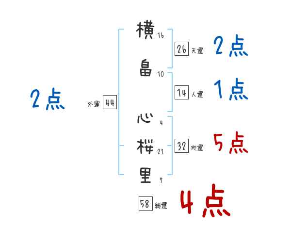 天運![]() | 横畠心桜里さんの天運は26画の2つ星!波瀾万丈かも。信頼できる人を大事にしましょう。 家系が持つ宿命的な運勢を表します。祖先から受け継いだ苗字ですので自分の力が及びません。家柄を象徴します。 |
