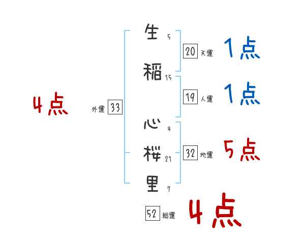 外運![]() | 生稲心桜里さんの外運は33画の4つ星!権力志向でプライドが高い。勇気があり運を切り開き成功する。 生活面を象徴する運勢です。外部から受ける影響力を表し、結婚運、家庭運や職場、環境への順応性を表します。 |