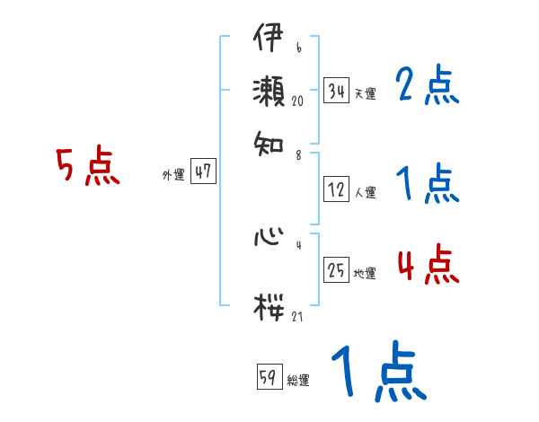 外運![]() | 伊瀬知心桜さんの外運は47画の5つ星!実力が開花し発展する円満な人生。財に恵まれる。 生活面を象徴する運勢です。外部から受ける影響力を表し、結婚運、家庭運や職場、環境への順応性を表します。 |