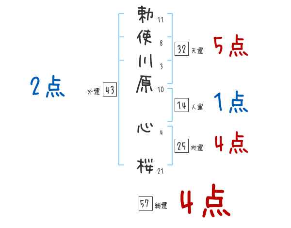 天運![]() | 勅使川原心桜さんの天運は32画の5つ星!柔軟性があり成功する。チャンスが多く金運が良い。 家系が持つ宿命的な運勢を表します。祖先から受け継いだ苗字ですので自分の力が及びません。家柄を象徴します。 |