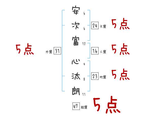 天運![]() | 安次富心汰朗さんの天運は24画の5つ星!家庭運が良く順調な人生。金運にも恵まれる。 家系が持つ宿命的な運勢を表します。祖先から受け継いだ苗字ですので自分の力が及びません。家柄を象徴します。 |
