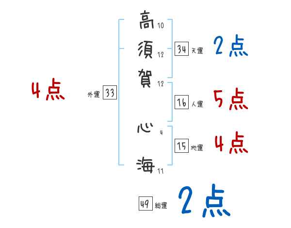 総運![]() | 高須賀心海さんの総運は49画の2つ星!不安定な性格で明暗がある人生。周りの人には支援されやすい。 あなたの人生を表す1番重要な運勢です。生涯を通じて影響する総合運となり、主に50歳以降の晩年期に影響を及ぼします。 |
