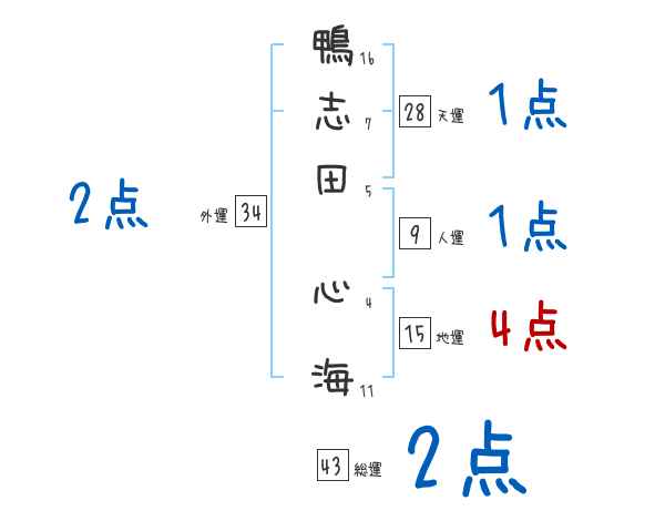 総運![]() | 鴨志田心海さんの総運は43画の2つ星!頑固な性格で独立心が強いかも。やや非現実的で浪費に注意しましょう。 あなたの人生を表す1番重要な運勢です。生涯を通じて影響する総合運となり、主に50歳以降の晩年期に影響を及ぼします。 |