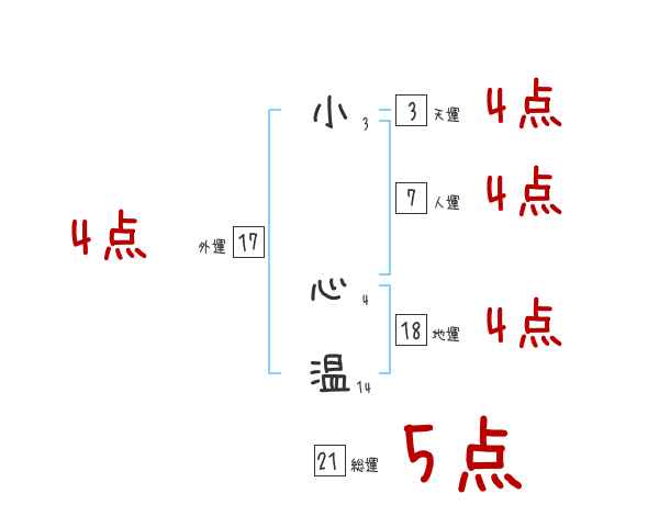 天運![]() | 小心温さんの天運は3画の4つ星!活動的で才能に恵まれ、多くの信頼を得る。希望に満ち成長する。 家系が持つ宿命的な運勢を表します。祖先から受け継いだ苗字ですので自分の力が及びません。家柄を象徴します。 |