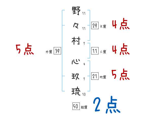 天運![]() | 野々村心玖琉さんの天運は29画の4つ星!完全主義で才能がある。厳格な心の持ち主。 家系が持つ宿命的な運勢を表します。祖先から受け継いだ苗字ですので自分の力が及びません。家柄を象徴します。 |
