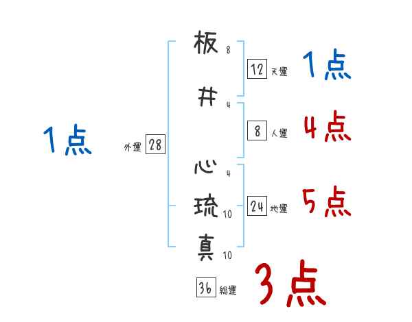 総運![]() | 板井心琉真さんの総運は36画の3つ星!先見性が豊かです。多少神経質で苦労することも。 あなたの人生を表す1番重要な運勢です。生涯を通じて影響する総合運となり、主に50歳以降の晩年期に影響を及ぼします。 |