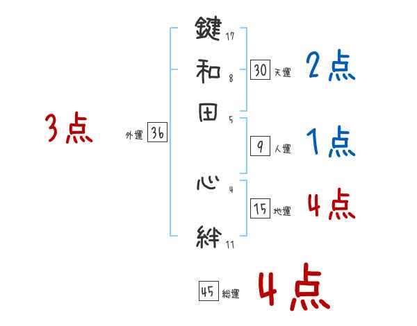 総運![]() | 鍵和田心絆さんの総運は45画の4つ星!もくもくと物事を進め達成する。地味な努力家。 あなたの人生を表す1番重要な運勢です。生涯を通じて影響する総合運となり、主に50歳以降の晩年期に影響を及ぼします。 |