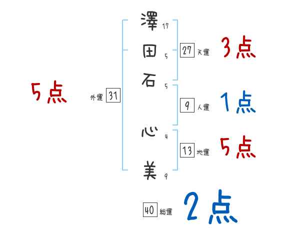 外運![]() | 澤田石心美さんの外運は31画の5つ星!社交性があり判断力に優れる。順風満帆な人生で円満な生活。 生活面を象徴する運勢です。外部から受ける影響力を表し、結婚運、家庭運や職場、環境への順応性を表します。 |