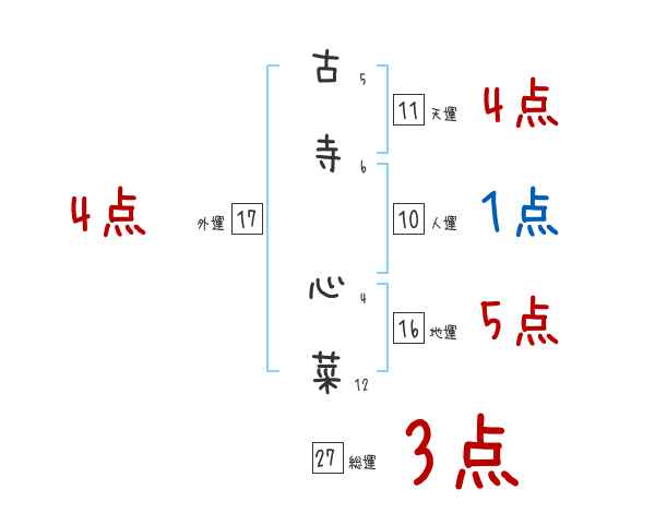 天運![]() | 古寺心菜さんの天運は11画の4つ星!着実に富や地位を得る幸運な人生。 家系が持つ宿命的な運勢を表します。祖先から受け継いだ苗字ですので自分の力が及びません。家柄を象徴します。 |