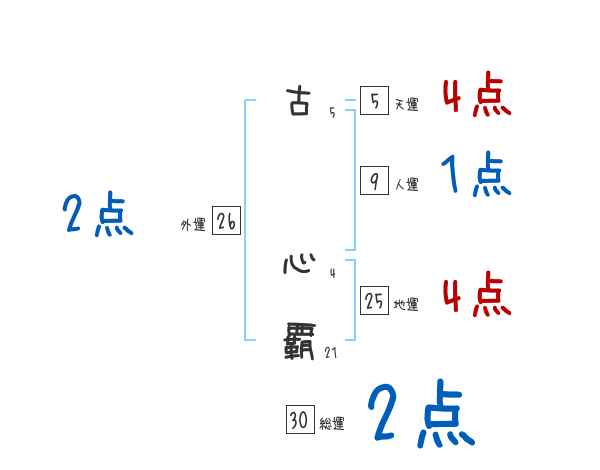 天運![]() | 古心覇さんの天運は5画の4つ星!健康で安泰。協調性に優れ、財産に恵まれる。 家系が持つ宿命的な運勢を表します。祖先から受け継いだ苗字ですので自分の力が及びません。家柄を象徴します。 |