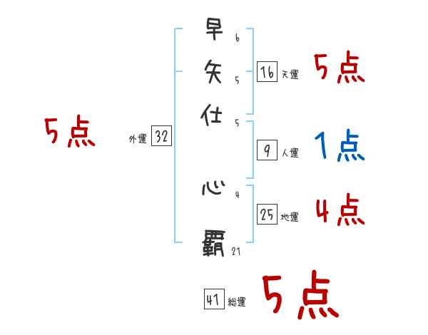 外運![]() | 早矢仕心覇さんの外運は32画の5つ星!柔軟性があり成功する。チャンスが多く金運が良い。 生活面を象徴する運勢です。外部から受ける影響力を表し、結婚運、家庭運や職場、環境への順応性を表します。 |