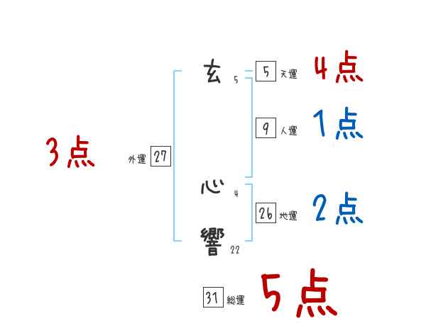 天運![]() | 玄心響さんの天運は5画の4つ星!健康で安泰。協調性に優れ、財産に恵まれる。 家系が持つ宿命的な運勢を表します。祖先から受け継いだ苗字ですので自分の力が及びません。家柄を象徴します。 |