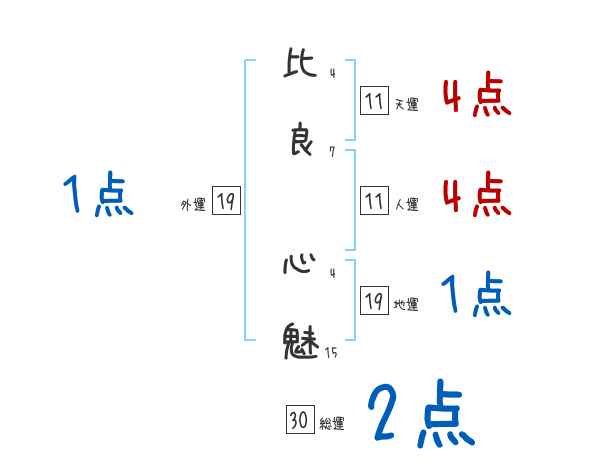 天運![]() | 比良心魅さんの天運は11画の4つ星!着実に富や地位を得る幸運な人生。 家系が持つ宿命的な運勢を表します。祖先から受け継いだ苗字ですので自分の力が及びません。家柄を象徴します。 |