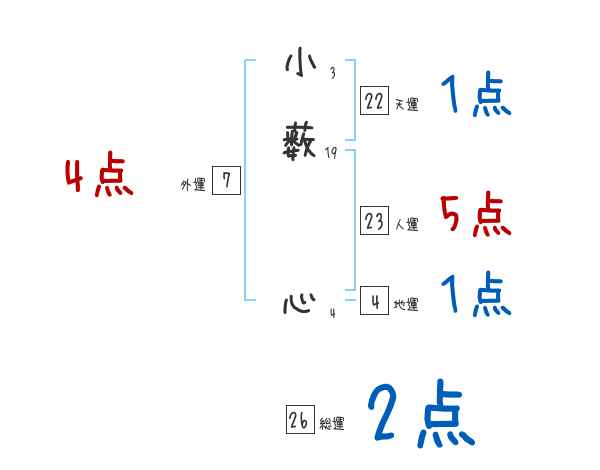 人運![]() | 小薮心さんの人運は23画の5つ星!想像力に優れ活力がある。一代で成功し名誉を手に入れる。 性格や才能などを表す2番目に重要な運勢です。人間関係や協調性、社会的な成功に影響します。主に20歳から50歳ぐらいまでの中年期の運勢を表します。 |