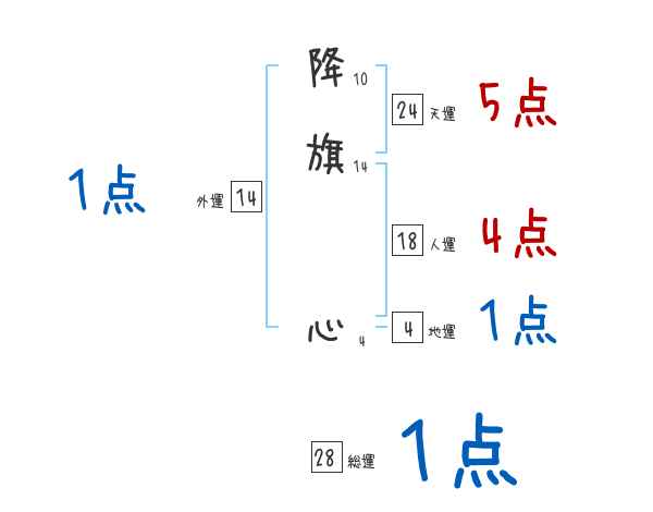 総運![]() | 降旗心さんの総運は28画の1つ星!家庭環境に注意。スポーツで活躍できる能力があるかも。 あなたの人生を表す1番重要な運勢です。生涯を通じて影響する総合運となり、主に50歳以降の晩年期に影響を及ぼします。 |