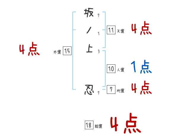 天運![]() | 坂ノ上忍さんの天運は11画の4つ星!着実に富や地位を得る幸運な人生。 家系が持つ宿命的な運勢を表します。祖先から受け継いだ苗字ですので自分の力が及びません。家柄を象徴します。 |