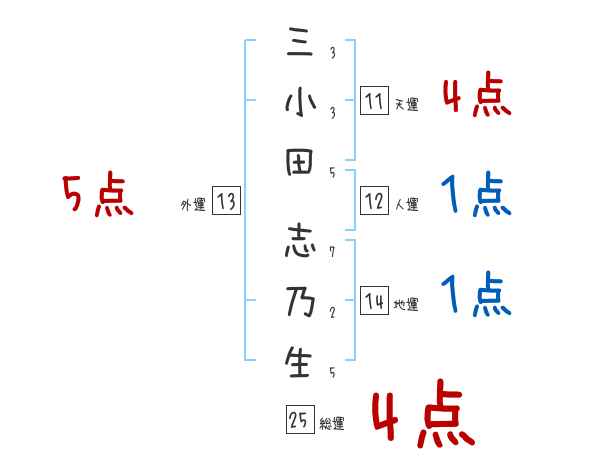 天運![]() | 三小田志乃生さんの天運は11画の4つ星!着実に富や地位を得る幸運な人生。 家系が持つ宿命的な運勢を表します。祖先から受け継いだ苗字ですので自分の力が及びません。家柄を象徴します。 |