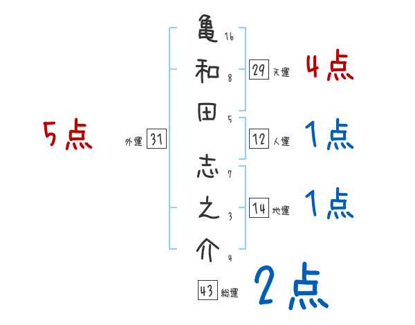 総運![]() | 亀和田志之介さんの総運は43画の2つ星!頑固な性格で独立心が強いかも。やや非現実的で浪費に注意しましょう。 あなたの人生を表す1番重要な運勢です。生涯を通じて影響する総合運となり、主に50歳以降の晩年期に影響を及ぼします。 |