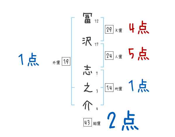総運![]() | 冨沢志之介さんの総運は43画の2つ星!頑固な性格で独立心が強いかも。やや非現実的で浪費に注意しましょう。 あなたの人生を表す1番重要な運勢です。生涯を通じて影響する総合運となり、主に50歳以降の晩年期に影響を及ぼします。 |