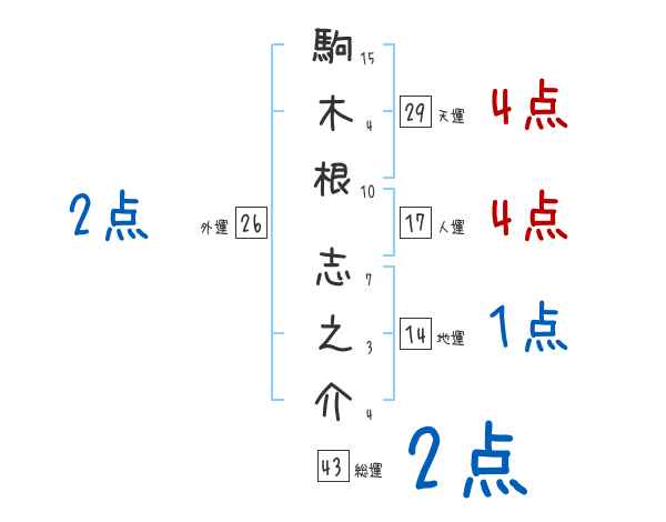 天運![]() | 駒木根志之介さんの天運は29画の4つ星!完全主義で才能がある。厳格な心の持ち主。 家系が持つ宿命的な運勢を表します。祖先から受け継いだ苗字ですので自分の力が及びません。家柄を象徴します。 |