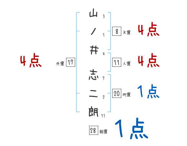 外運![]() | 山ノ井志二朗さんの外運は17画の4つ星!積極的な行動力。地位を気づき財産を手に入れる。純粋な心と直感力。 生活面を象徴する運勢です。外部から受ける影響力を表し、結婚運、家庭運や職場、環境への順応性を表します。 |