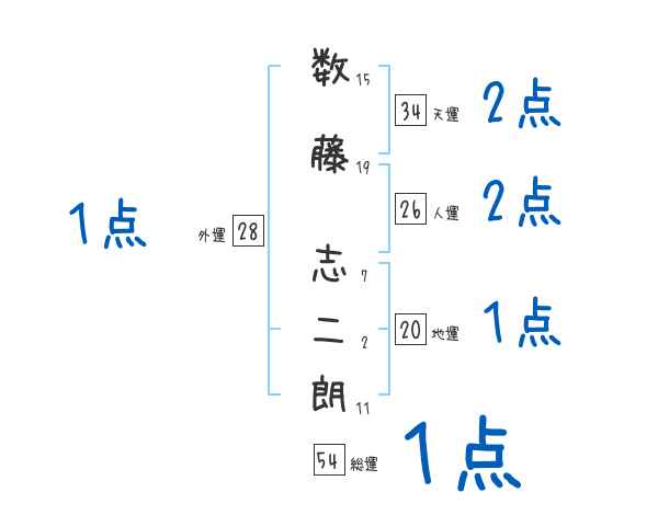 総運![]() | 数藤志二朗さんの総運は54画の1つ星!トラブルが多いかも。周りをよく見て協調して過ごしましょう。 あなたの人生を表す1番重要な運勢です。生涯を通じて影響する総合運となり、主に50歳以降の晩年期に影響を及ぼします。 |