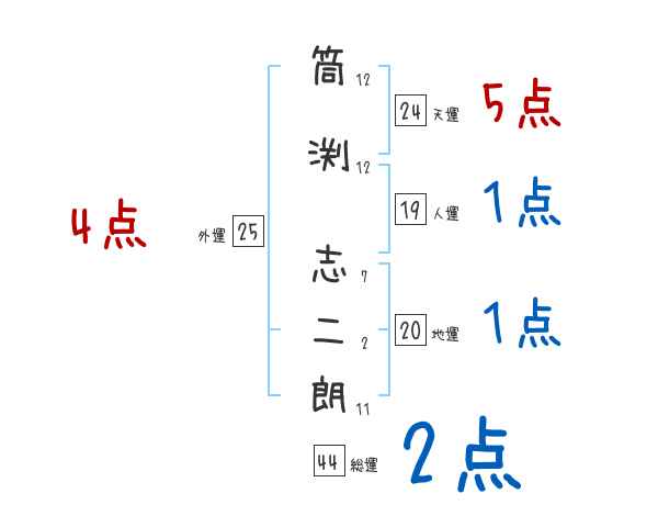 総運![]() | 筒渕志二朗さんの総運は44画の2つ星!誠実で慎重な性格。物事を考えすぎないように注意しましょう。 あなたの人生を表す1番重要な運勢です。生涯を通じて影響する総合運となり、主に50歳以降の晩年期に影響を及ぼします。 |