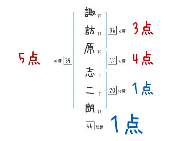 天運![]() | 諏訪原志二朗さんの天運は36画の3つ星!先見性が豊かです。多少神経質で苦労することも。 家系が持つ宿命的な運勢を表します。祖先から受け継いだ苗字ですので自分の力が及びません。家柄を象徴します。 |