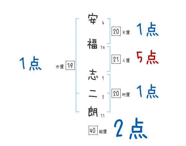 外運![]() | 安福志二朗さんの外運は19画の1つ星!優れた才能を持ちますが、協調性が足りないことも。周りの人と協力する事を意識しましょう。 生活面を象徴する運勢です。外部から受ける影響力を表し、結婚運、家庭運や職場、環境への順応性を表します。 |
