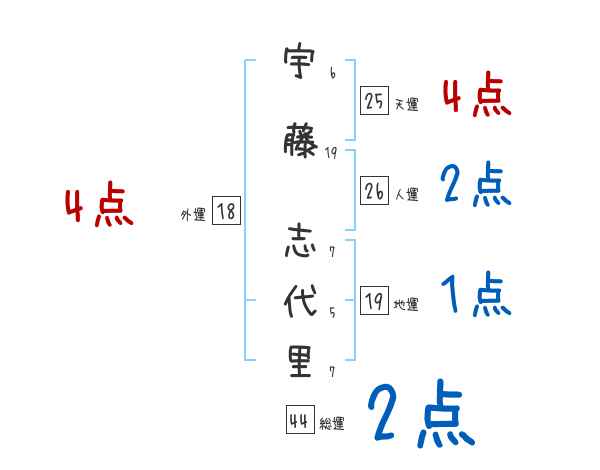 総運![]() | 宇藤志代里さんの総運は44画の2つ星!誠実で慎重な性格。物事を考えすぎないように注意しましょう。 あなたの人生を表す1番重要な運勢です。生涯を通じて影響する総合運となり、主に50歳以降の晩年期に影響を及ぼします。 |