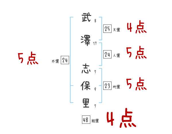 外運![]() | 武澤志保里さんの外運は24画の5つ星!家庭運が良く順調な人生。金運にも恵まれる。 生活面を象徴する運勢です。外部から受ける影響力を表し、結婚運、家庭運や職場、環境への順応性を表します。 |