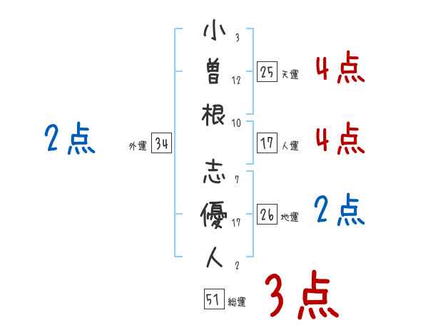 外運![]() | 小曽根志優人さんの外運は34画の2つ星!独創性に優れるが、自尊心が強く災難に注意しましょう。 生活面を象徴する運勢です。外部から受ける影響力を表し、結婚運、家庭運や職場、環境への順応性を表します。 |