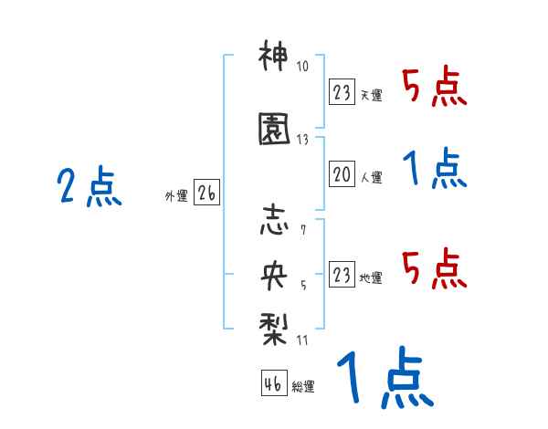 天運![]() | 神園志央梨さんの天運は23画の5つ星!想像力に優れ活力がある。一代で成功し名誉を手に入れる。 家系が持つ宿命的な運勢を表します。祖先から受け継いだ苗字ですので自分の力が及びません。家柄を象徴します。 |
