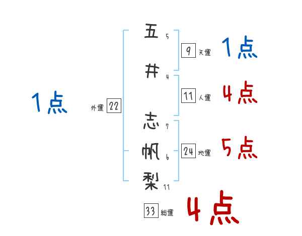 外運![]() | 五井志帆梨さんの外運は22画の1つ星!努力することが苦手ないっぽう手先が器用。芸術性にも優れる。 生活面を象徴する運勢です。外部から受ける影響力を表し、結婚運、家庭運や職場、環境への順応性を表します。 |