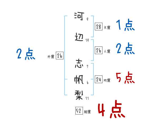 外運![]() | 河辺志帆梨さんの外運は26画の2つ星!波瀾万丈かも。信頼できる人を大事にしましょう。 生活面を象徴する運勢です。外部から受ける影響力を表し、結婚運、家庭運や職場、環境への順応性を表します。 |