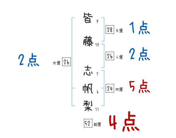 外運![]() | 皆藤志帆梨さんの外運は26画の2つ星!波瀾万丈かも。信頼できる人を大事にしましょう。 生活面を象徴する運勢です。外部から受ける影響力を表し、結婚運、家庭運や職場、環境への順応性を表します。 |