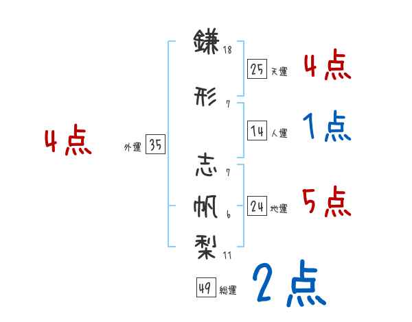 天運![]() | 鎌形志帆梨さんの天運は25画の4つ星!個性があり才能があふれる。強運の持ち主で発展する。 家系が持つ宿命的な運勢を表します。祖先から受け継いだ苗字ですので自分の力が及びません。家柄を象徴します。 |