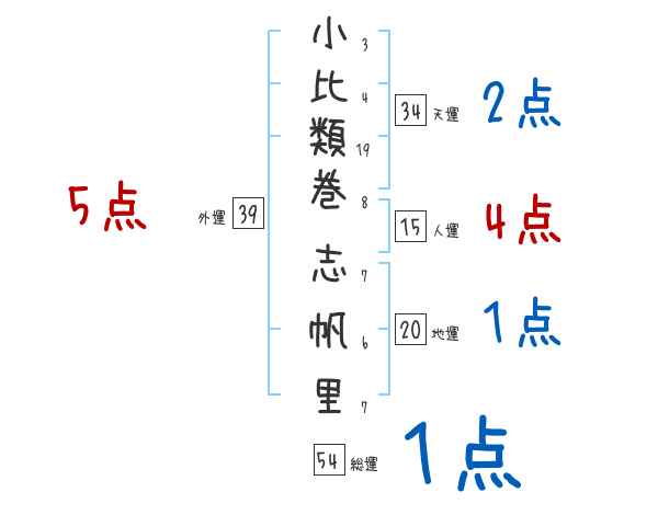 外運![]() | 小比類巻志帆里さんの外運は39画の5つ星!社交性に優れ人望が厚い。人の上に立ち成功する。 生活面を象徴する運勢です。外部から受ける影響力を表し、結婚運、家庭運や職場、環境への順応性を表します。 |