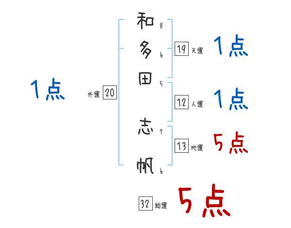 総運![]() | 和多田志帆さんの総運は32画の5つ星!柔軟性があり成功する。チャンスが多く金運が良い。 あなたの人生を表す1番重要な運勢です。生涯を通じて影響する総合運となり、主に50歳以降の晩年期に影響を及ぼします。 |