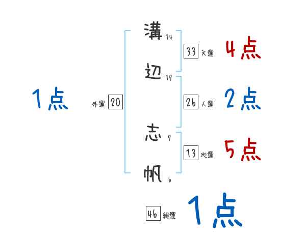 総運![]() | 溝辺志帆さんの総運は46画の1つ星!迷走することが多く苦労するかも。目先のことにとらわれないように。 あなたの人生を表す1番重要な運勢です。生涯を通じて影響する総合運となり、主に50歳以降の晩年期に影響を及ぼします。 |