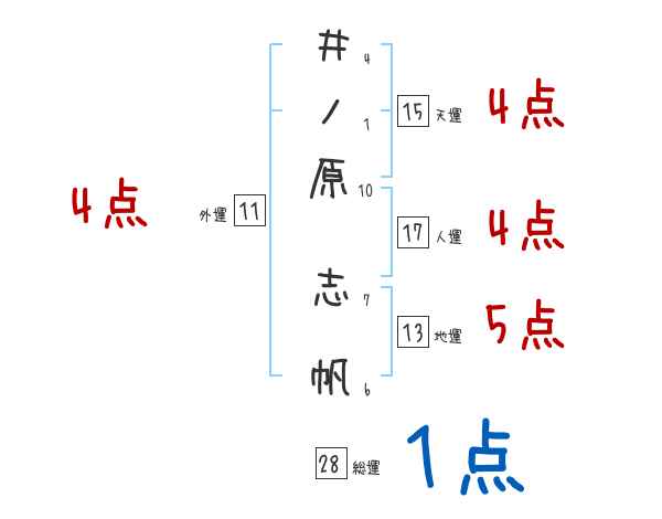 総運![]() | 井ノ原志帆さんの総運は28画の1つ星!家庭環境に注意。スポーツで活躍できる能力があるかも。 あなたの人生を表す1番重要な運勢です。生涯を通じて影響する総合運となり、主に50歳以降の晩年期に影響を及ぼします。 |