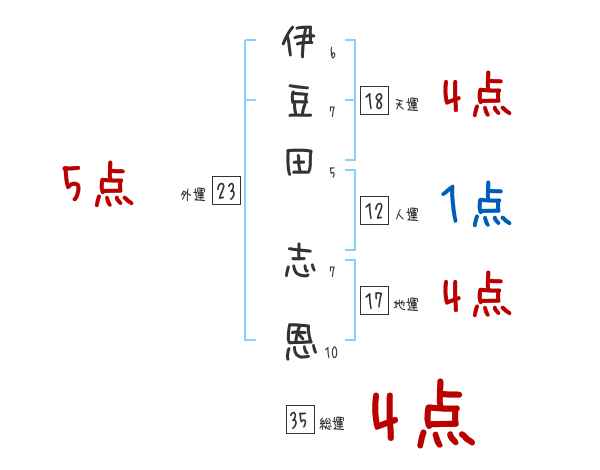 外運![]() | 伊豆田志恩さんの外運は23画の5つ星!想像力に優れ活力がある。一代で成功し名誉を手に入れる。 生活面を象徴する運勢です。外部から受ける影響力を表し、結婚運、家庭運や職場、環境への順応性を表します。 |