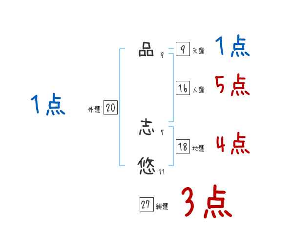 天運![]() | 品志悠さんの天運は9画の1つ星!消極的で才能を発揮することが苦手なことも。周りの意見に耳を傾けましょう。 家系が持つ宿命的な運勢を表します。祖先から受け継いだ苗字ですので自分の力が及びません。家柄を象徴します。 |