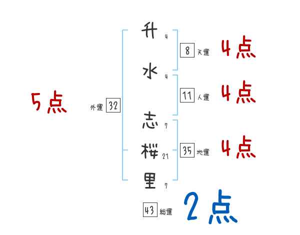 外運![]() | 升水志桜里さんの外運は32画の5つ星!柔軟性があり成功する。チャンスが多く金運が良い。 生活面を象徴する運勢です。外部から受ける影響力を表し、結婚運、家庭運や職場、環境への順応性を表します。 |