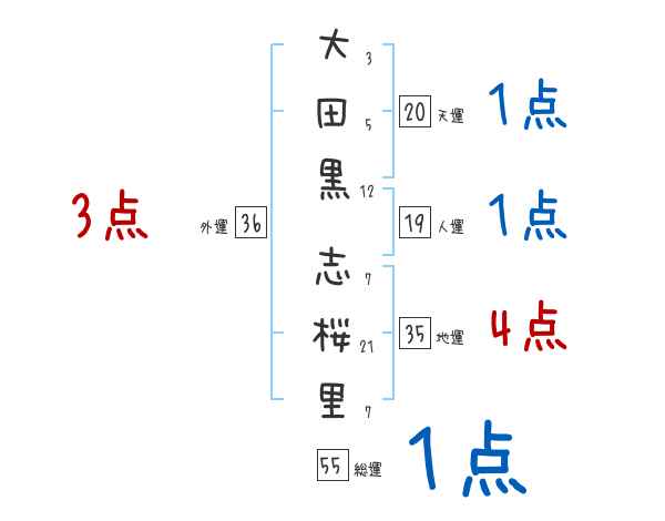 外運![]() | 大田黒志桜里さんの外運は36画の3つ星!先見性が豊かです。多少神経質で苦労することも。 生活面を象徴する運勢です。外部から受ける影響力を表し、結婚運、家庭運や職場、環境への順応性を表します。 |